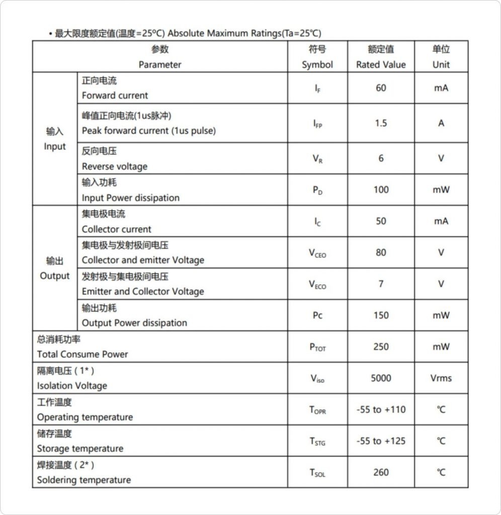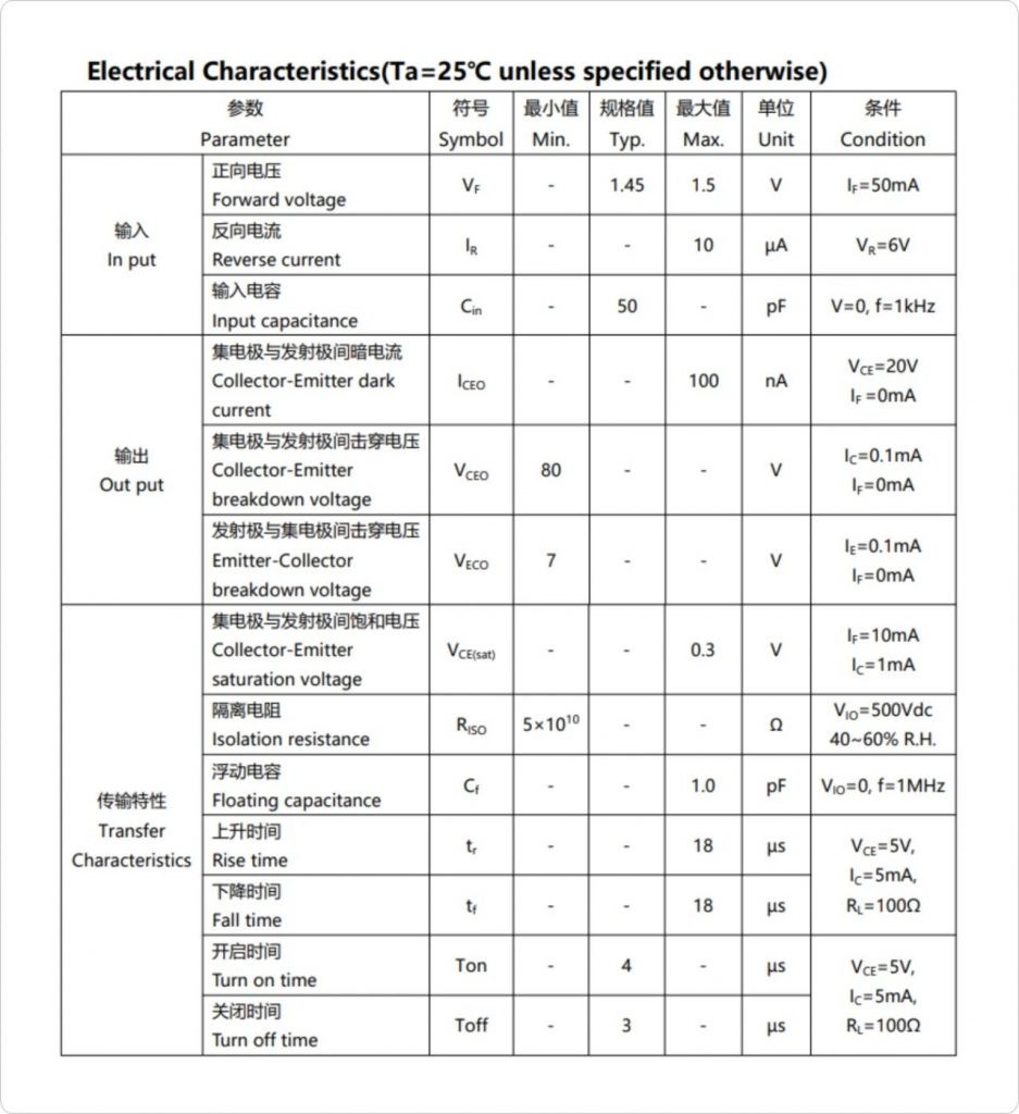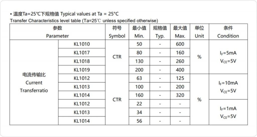 • 电流转换率(Current transfer ratio) (CTR: 50~600% at IF = 5mA, VCE = 5V)