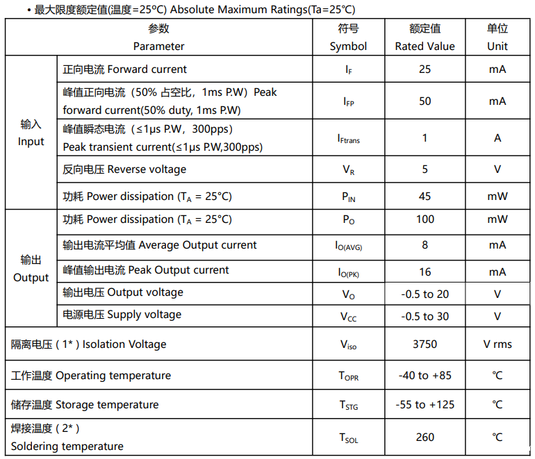 ◆输入与输出间高隔离电压(Viso=3750 V rms)