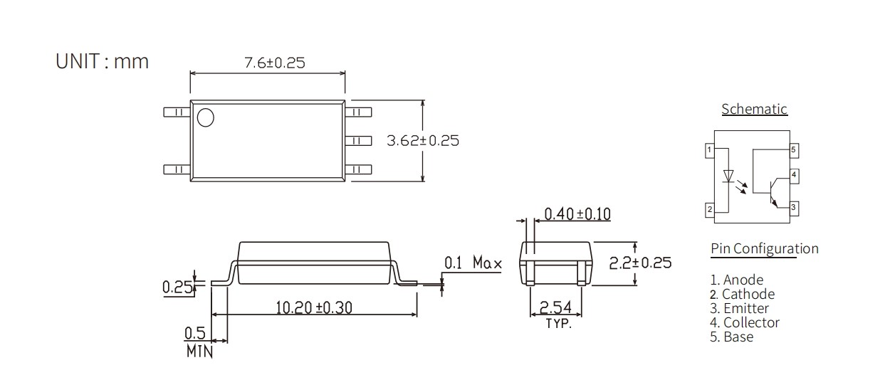 | Product | Package | size(LxWxHmm) | VF (V) | BV CEO (Min) (V) | V CE(SAT) (Max) (V) | IF (mA) | CTR (%) | tr (uS) | tf (uS) | ton (uS) | toff (uS) | Topr (Min) (degC) | Topr (Max) (degC) | Viso (Vrms) |