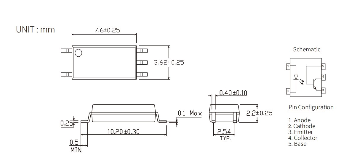 | Product | Package | size(LxWxHmm) | VF (V) | BV CEO (Min) (V) | V CE(SAT) (Max) (V) | IF (mA) | CTR (%) | tr (uS) | tf (uS) | ton (uS) | toff (uS) | Topr (Min) (degC) | Topr (Max) (degC) | Viso (Vrms) |