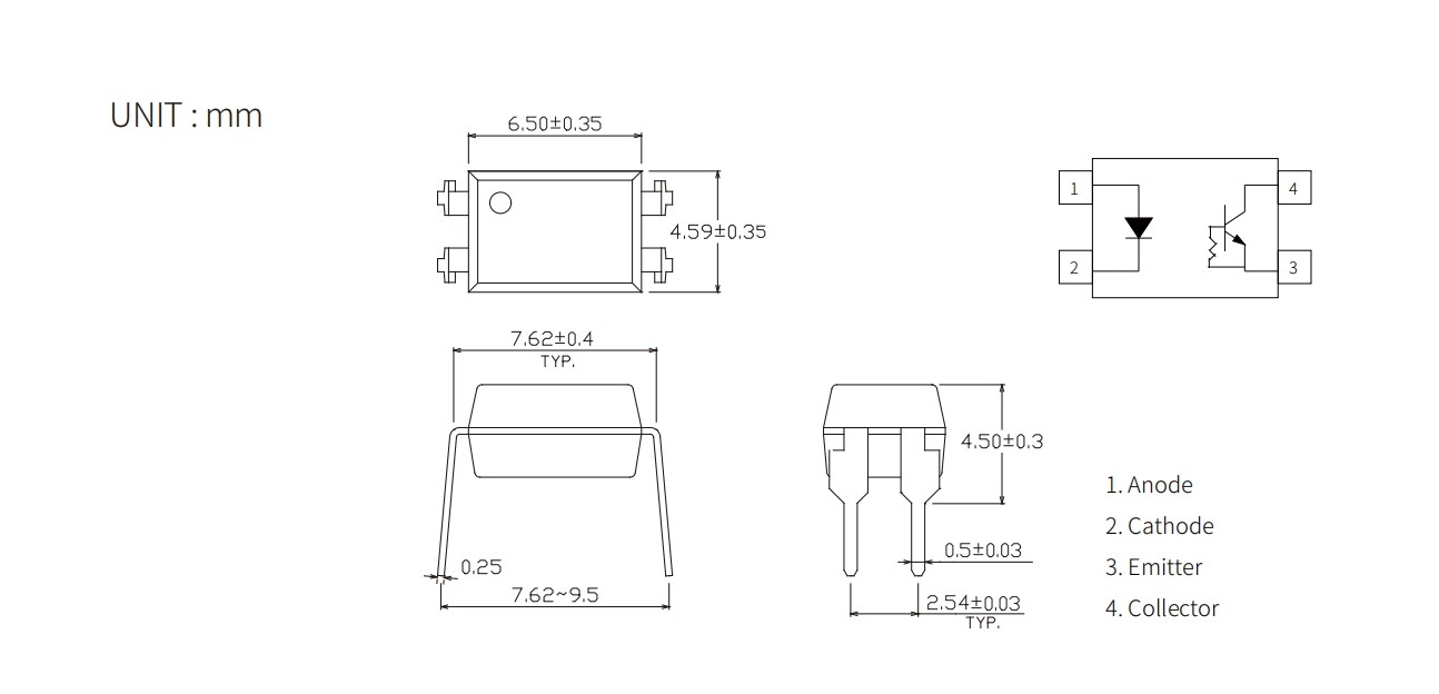 | Product | Package | size(LxWxHmm) | VF (V) | BV CEO (Min) (V) | V CE(SAT) (Max) (V) | IF (mA) | CTR (%) | tr (uS) | tf (uS) | ton (uS) | toff (uS) | Topr (Min) (degC) | Topr (Max) (degC) | Viso (Vrms) |