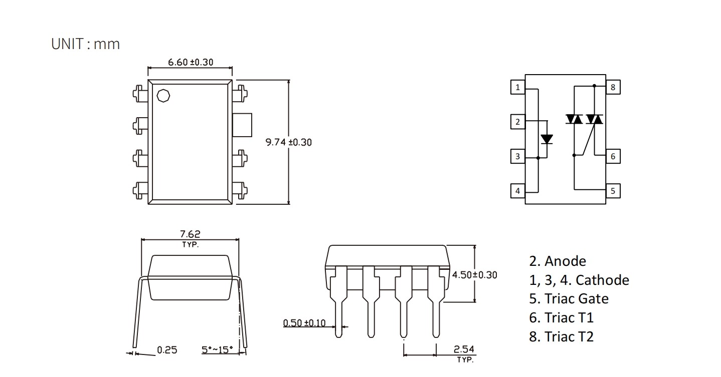 | Product | Package | size(LxWxHmm) | VF(V) | VDRM(Max) (V) | VTM(V) | VINH(V) | IT (rms)(mA) | IFT(mA) | Topr (Min) (degC) | Topr (Max) (degC) | Viso (Vrms) |